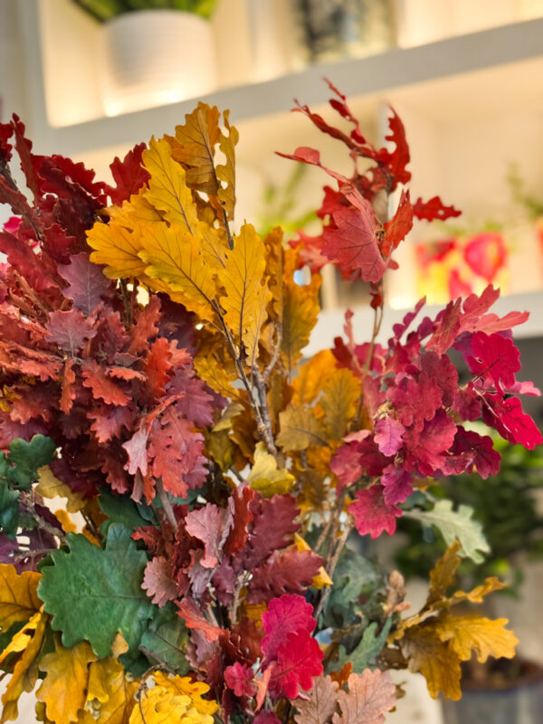 Τα κερωμένα φύλλα προέρχονται από αυθεντικά φθινοπωρινά κλαδιά, επεξεργασμένα με ειδική φυσική επίστρωση κεριού που διατηρεί το σχήμα, το χρώμα και την υφή τους για πολλούς μήνες. Οι αποχρώσεις τους κυμαίνονται από βαθύ κόκκινο και χρυσοκίτρινο έως πράσινο ελιάς και καφέ κεραμιδί, δημιουργώντας έναν πλούσιο, ζεστό συνδυασμό που θυμίζει τα φθινοπωρινά δάση λίγο πριν τον χειμώνα. Κάθε φύλλο έχει τη δική του φυσική ιδιομορφία, προσδίδοντας μοναδικότητα σε κάθε ανθοσύνθεση ή διακοσμητικό σύνολο.