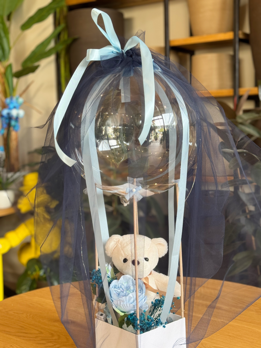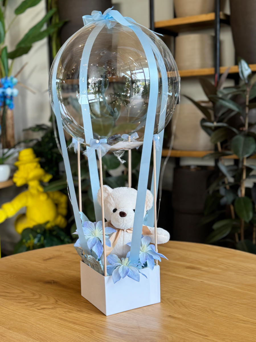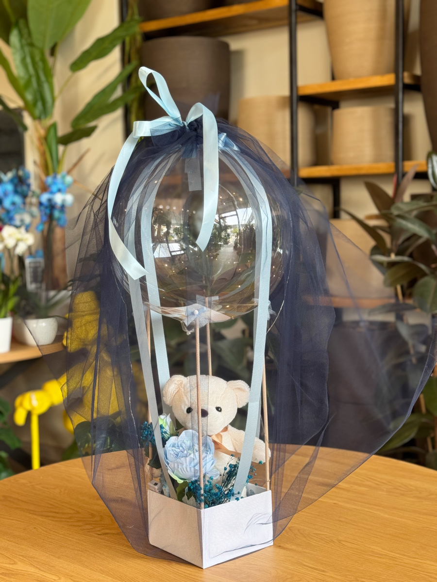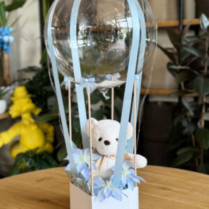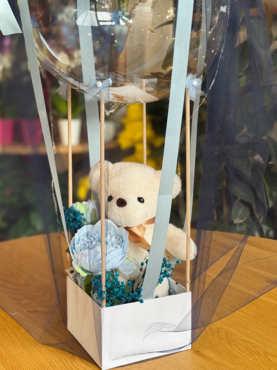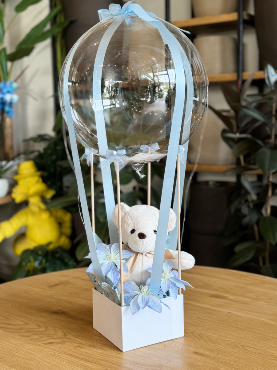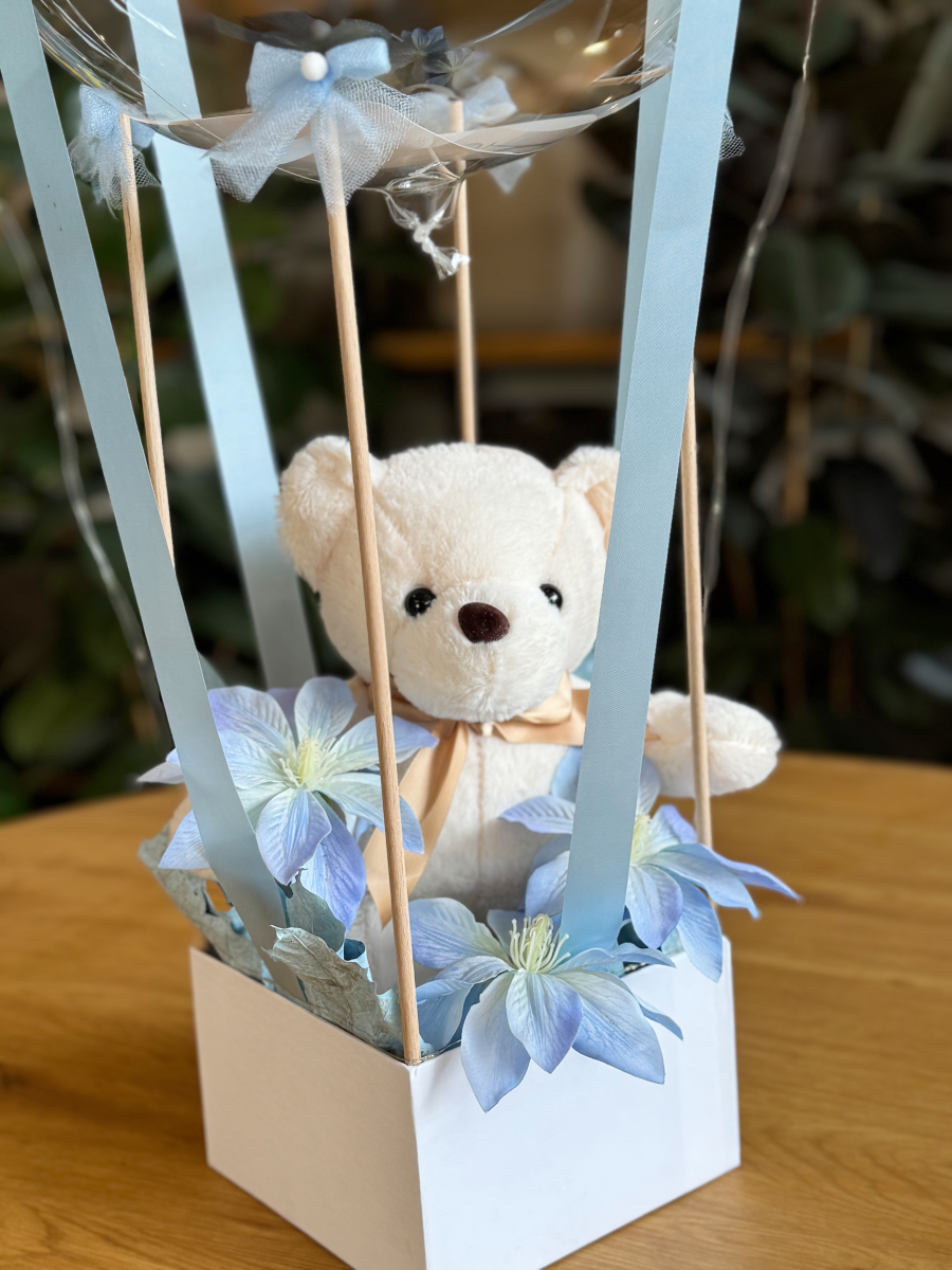Το «καλάθι» του αερόστατου, μια κομψή, λευκή τετράγωνη βάση, λειτουργεί ως το σταθερό σημείο εκκίνησης. Είναι διακοσμημένο με λεπτεπίλεπτα γαλάζια άνθη, τα οποία προσθέτουν μια νότα φρεσκάδας και χρώματος, δημιουργώντας την τέλεια αντίθεση με το λευκό του κουτιού και την αρκούδα. Αυτά τα άνθη μιμούνται μικρά σύννεφα ή τα πρώτα ανοιξιάτικα λουλούδια, ενισχύοντας τη γαλήνια αίσθηση της σύνθεσης.