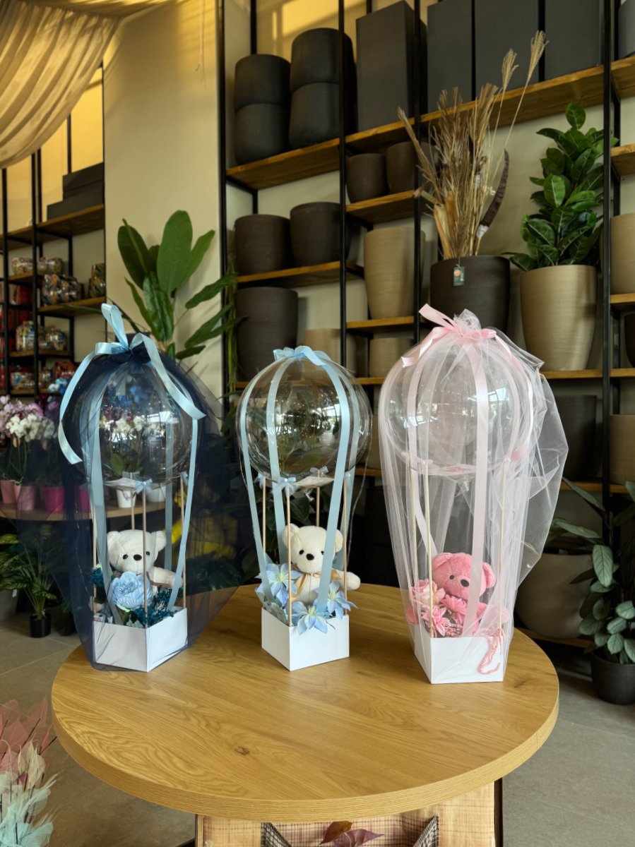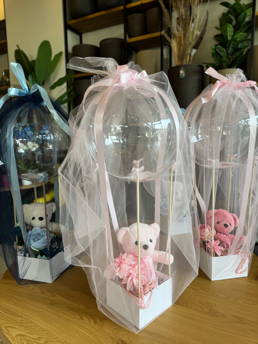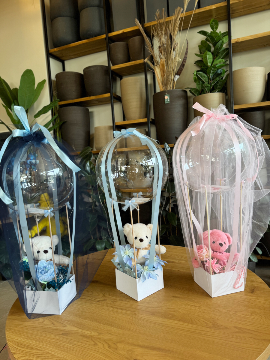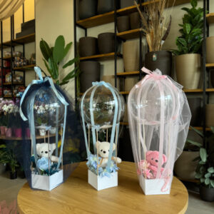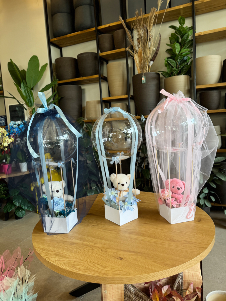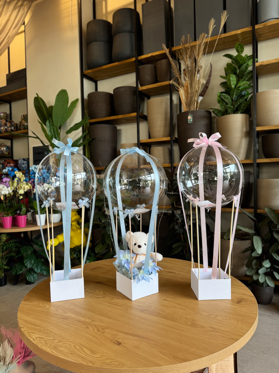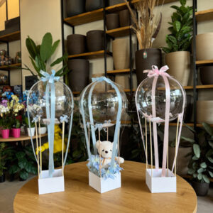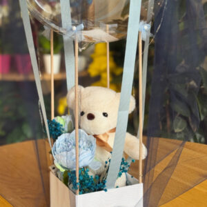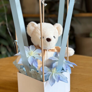 Το «καλάθι» του αερόστατου, μια κομψή, λευκή τετράγωνη βάση, λειτουργεί ως το σταθερό σημείο εκκίνησης. Είναι διακοσμημένο με λεπτεπίλεπτα γαλάζια άνθη, τα οποία προσθέτουν μια νότα φρεσκάδας και χρώματος, δημιουργώντας την τέλεια αντίθεση με το λευκό του κουτιού και την αρκούδα. Αυτά τα άνθη μιμούνται μικρά σύννεφα ή τα πρώτα ανοιξιάτικα λουλούδια, ενισχύοντας τη γαλήνια αίσθηση της σύνθεσης.