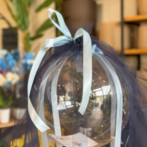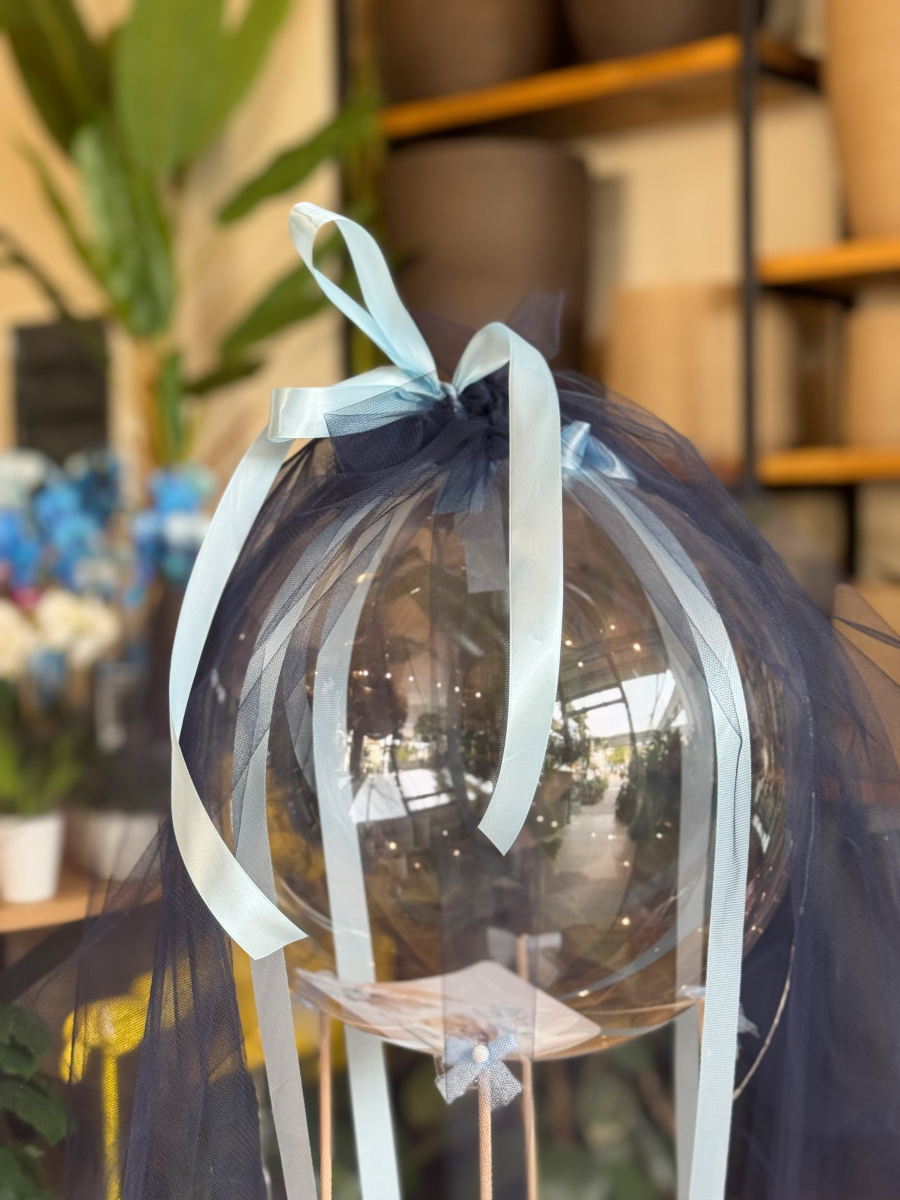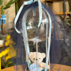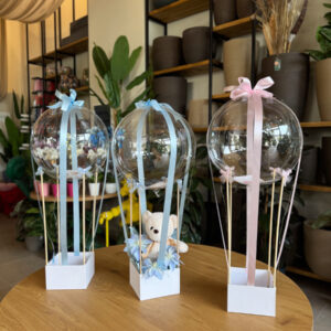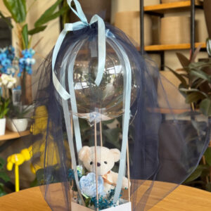 Ολόκληρη η δομή συγκρατείται από τέσσερα λεπτά, χρυσαφί στηρίγματα που μιμούνται την ξύλινη ή μεταλλική κατασκευή του αερόστατου. Οι λεπτές γαλάζιες κορδέλες (σε ματ και σατέν υφή) αγκαλιάζουν τη σφαίρα, ολοκληρώνοντας το παραμυθένιο design. Κάθε λεπτομέρεια, από τους μικρούς φιόγκους στις κορδέλες μέχρι την προσεκτική τοποθέτηση της αρκούδας, έχει επιλεγεί για να προσφέρει μια αίσθηση πολυτέλειας και χειροποίητης φροντίδας. Η επιλογή του παστέλ γαλάζιου χρώματος είναι η κλασική πινελιά για αγοράκια, αλλά η σύνθεση είναι τόσο διακριτική που ταιριάζει αρμονικά σε κάθε στυλ παιδικής διακόσμησης.
