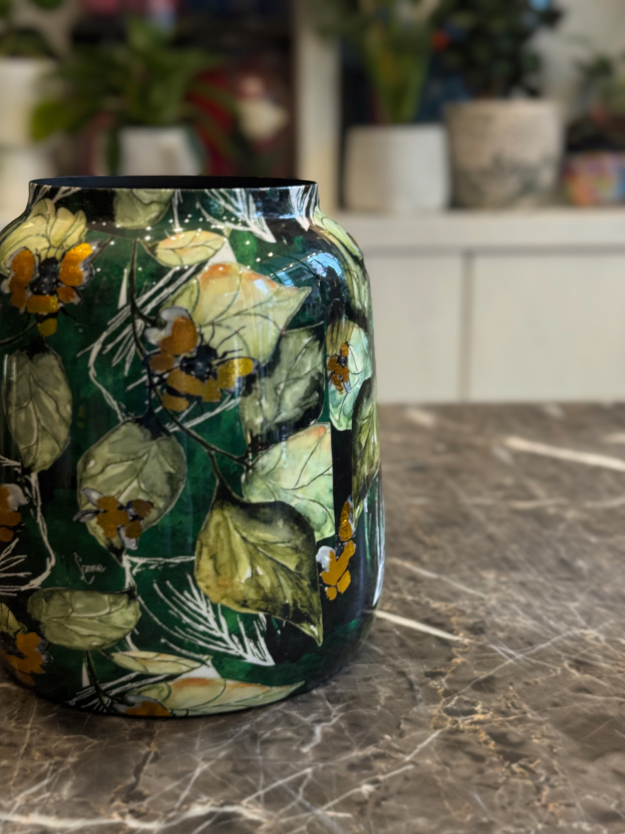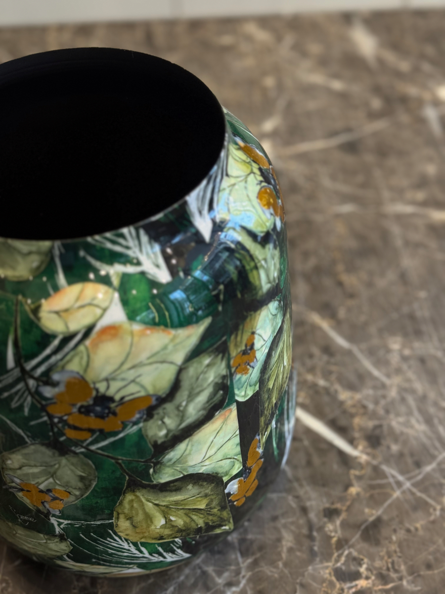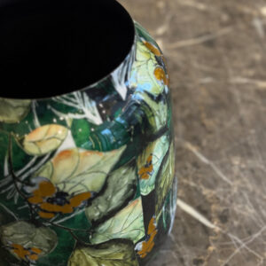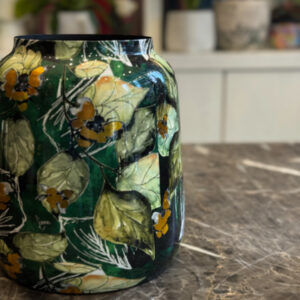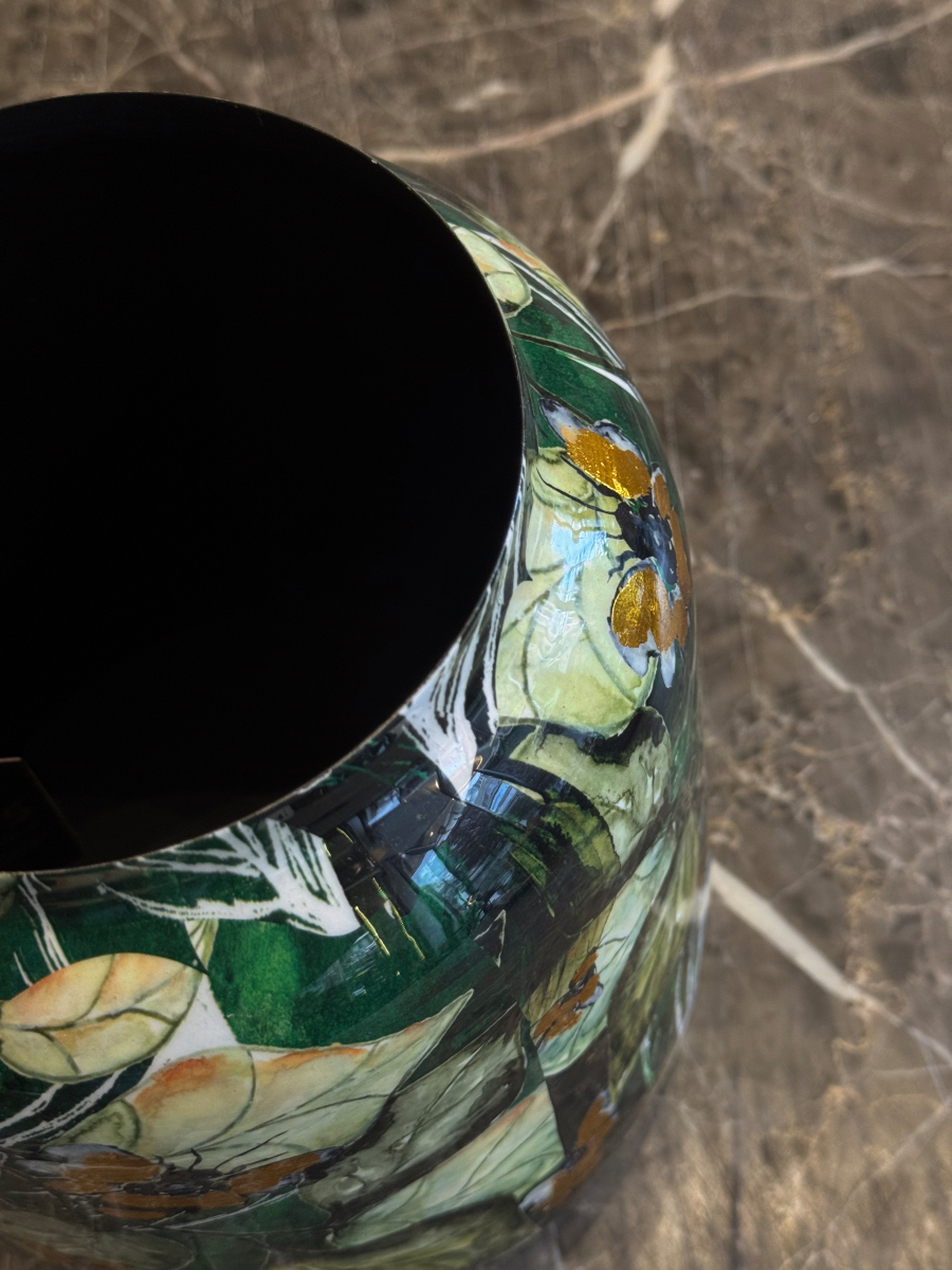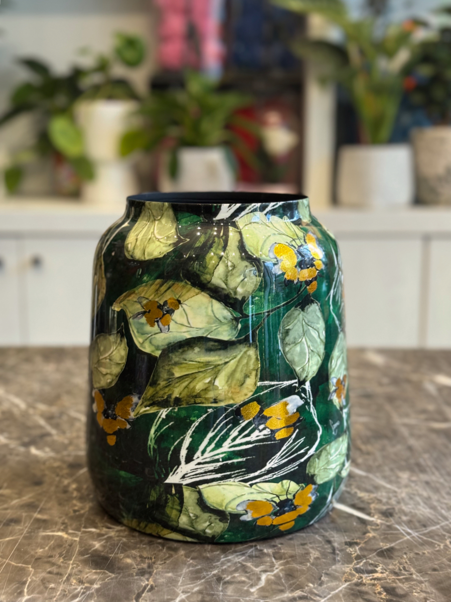 Το μεταλλικό βάζο “Botanical Art” αποτελεί ένα εντυπωσιακό διακοσμητικό κομμάτι με φλοράλ σχέδιο που αποπνέει φυσική αρμονία και καλλιτεχνική αισθητική. Οι αποχρώσεις του πράσινου, του μαύρου και του χρυσού δημιουργούν μια αίσθηση βάθους και κομψότητας, ενώ το γυαλιστερό του φινίρισμα προσδίδει πολυτελή λάμψη. Ιδανικό για φρέσκα ή αποξηραμένα λουλούδια, αλλά και ως ανεξάρτητο διακοσμητικό στοιχείο.