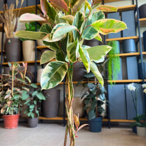 Ο Φίκος Ελάστικα Ροζ (Ficus elastica ‘Ruby’) είναι μια ιδιαίτερη ποικιλία του κλασικού Φίκου Ελάστικα, γνωστή για τα εντυπωσιακά ροζ, πράσινα και κρεμ φύλλα της. Αποτελεί ιδανική επιλογή για εσωτερικούς χώρους, καθώς προσθέτει μια μοναδική αισθητική και είναι εξαιρετικά ανθεκτικός.