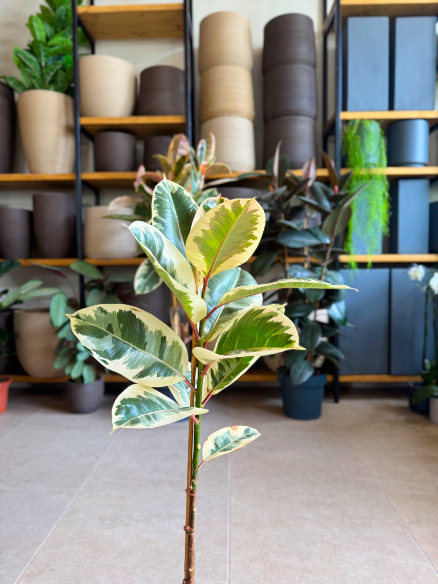 Ο Φίκος Ελάστικα Ροζ (Ficus elastica ‘Ruby’) είναι μια ιδιαίτερη ποικιλία του κλασικού Φίκου Ελάστικα, γνωστή για τα εντυπωσιακά ροζ, πράσινα και κρεμ φύλλα της. Αποτελεί ιδανική επιλογή για εσωτερικούς χώρους, καθώς προσθέτει μια μοναδική αισθητική και είναι εξαιρετικά ανθεκτικός.