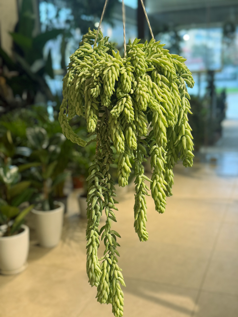 Η Sedum Morganianum Burrito, γνωστή και ως Ουρά Γαϊδάρου, είναι ένα εντυπωσιακό παχύφυτο με κρεμοκλαδή, σαρκώδη φύλλα σε απαλή πράσινη απόχρωση. Το ιδιαίτερο σχήμα της την καθιστά ιδανική για κρεμαστές γλάστρες ή ράφια, προσφέροντας φυσική κομψότητα και χαλαρή αισθητική στον χώρο.