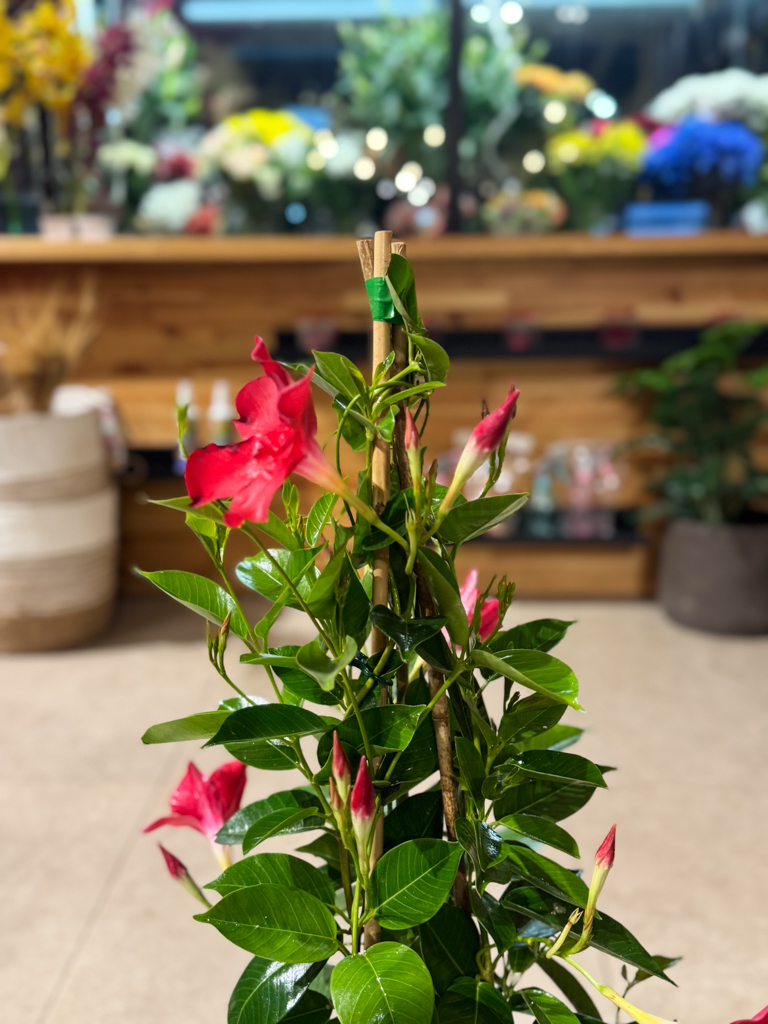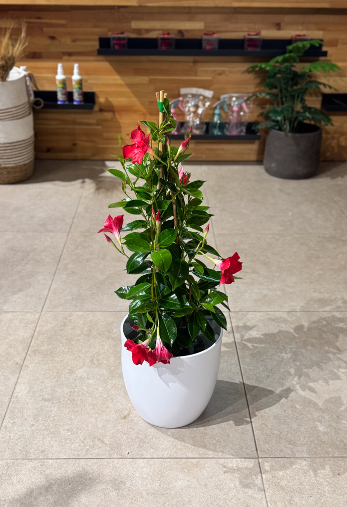 Η Διπλαδένια είναι ένα εντυπωσιακό τροπικό καλλωπιστικό φυτό, ιδιαίτερα αγαπητό για τα μεγάλα, ζωηρόχρωμα άνθη του και το γυαλιστερό, σκούρο πράσινο φύλλωμά του. Τα άνθη της εμφανίζονται σε αποχρώσεις του κόκκινου, ροζ και λευκού, χαρίζοντας έντονο χρώμα σε μπαλκόνια, κήπους και βεράντες από την άνοιξη έως και το φθινόπωρο.