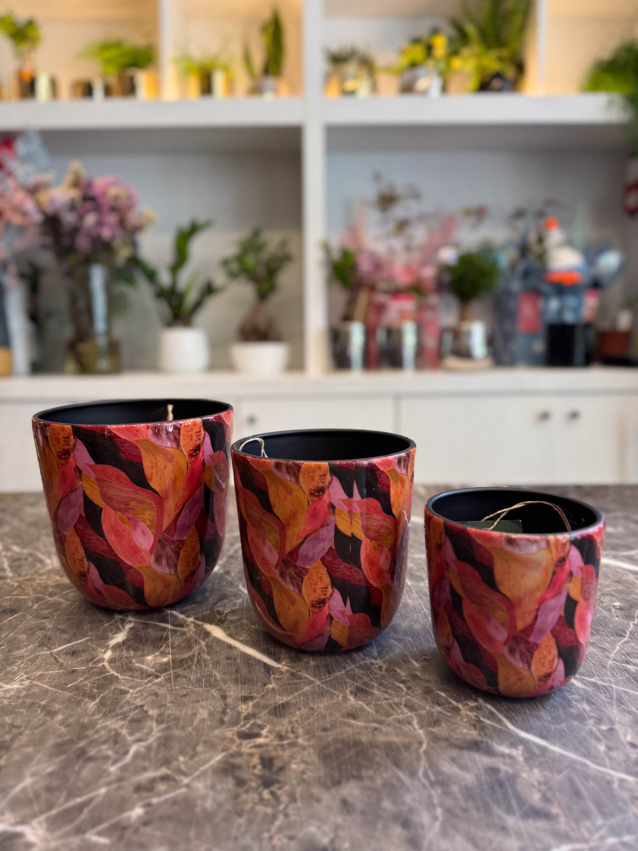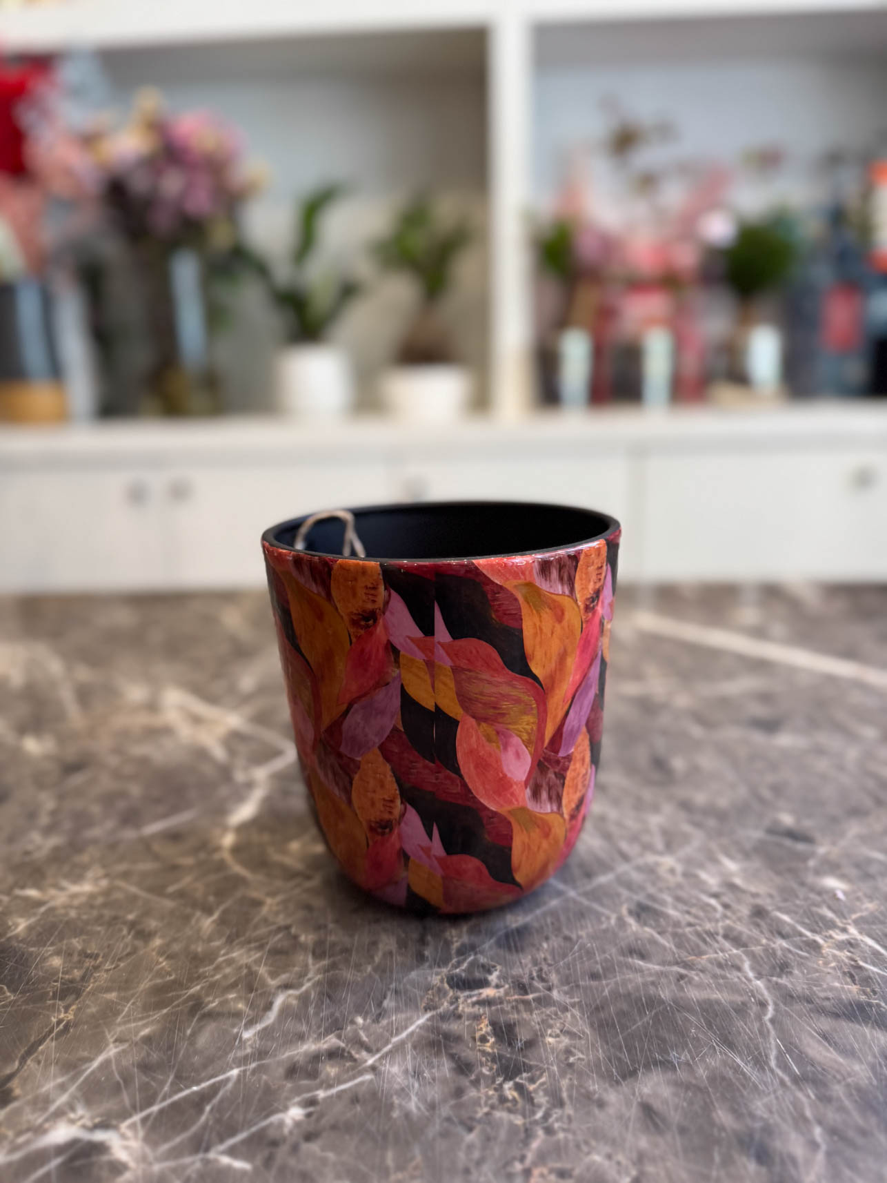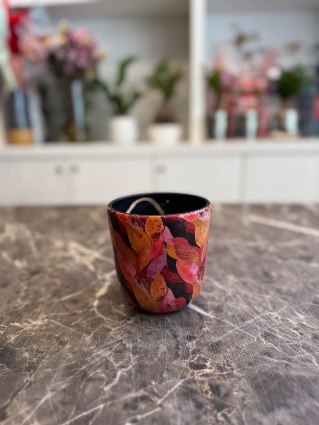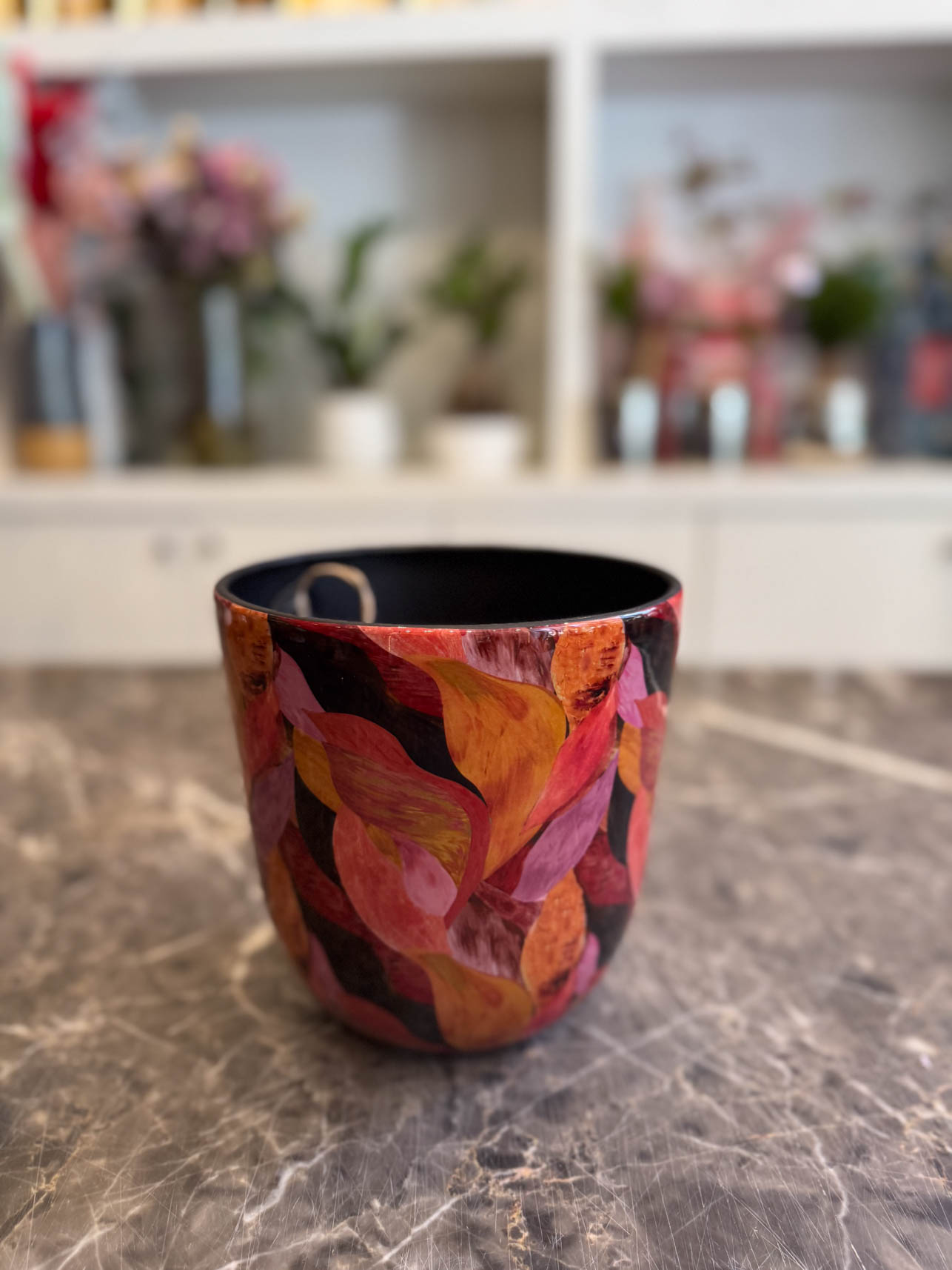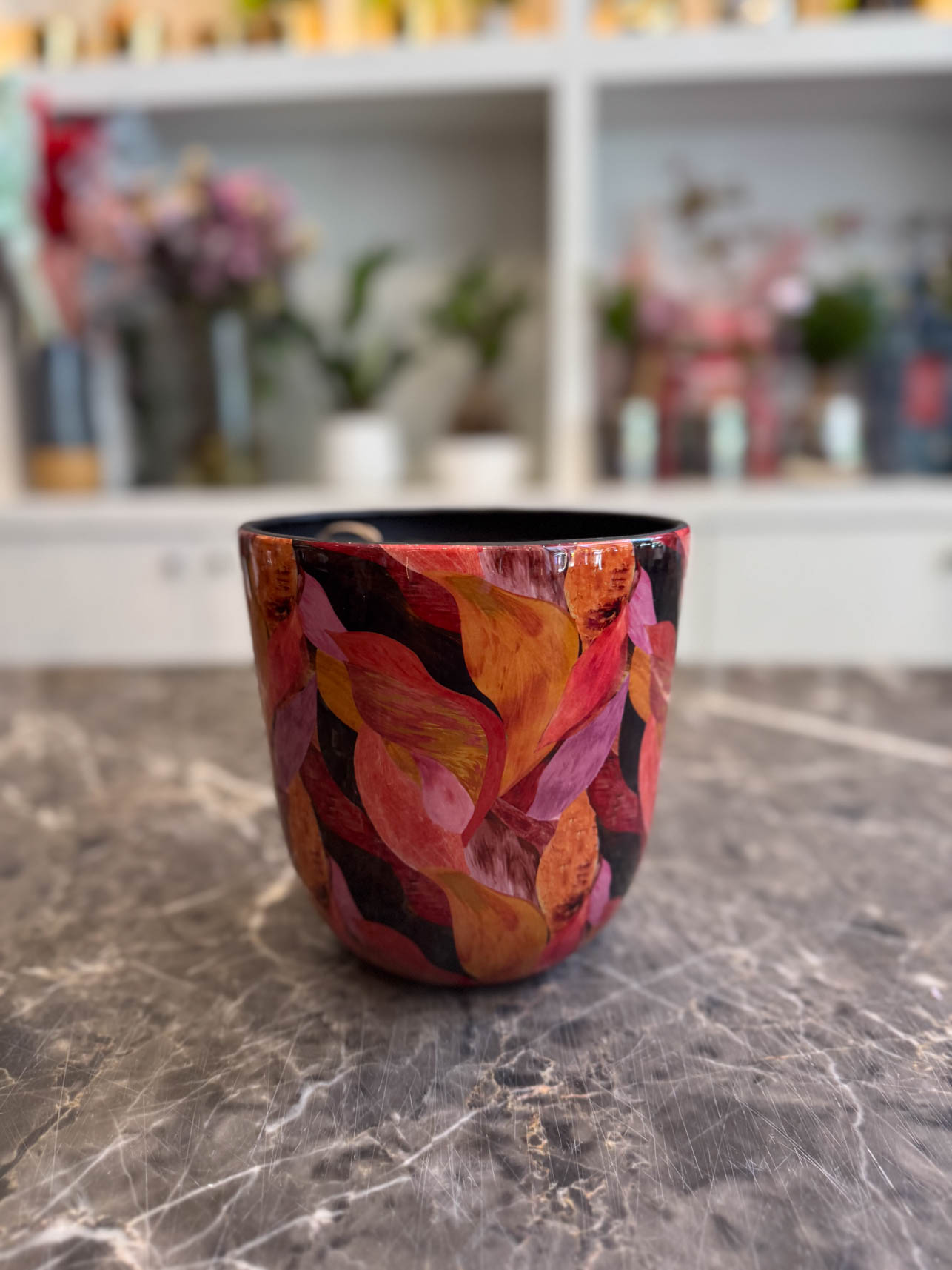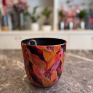 Το “Vulcano” είναι ένα δυναμικό και εκφραστικό χειροποίητο κασπώ, εμπνευσμένο από τη δύναμη της φωτιάς και των ηφαιστειακών χρωμάτων. Τα φύλλα σε έντονες αποχρώσεις του κόκκινου, του πορτοκαλί, του μπορντό και του ροζ δημιουργούν ένα ζωντανό, ενεργητικό αποτέλεσμα που δίνει ένταση και προσωπικότητα στον χώρο.