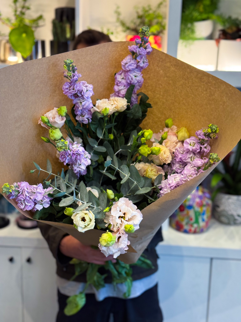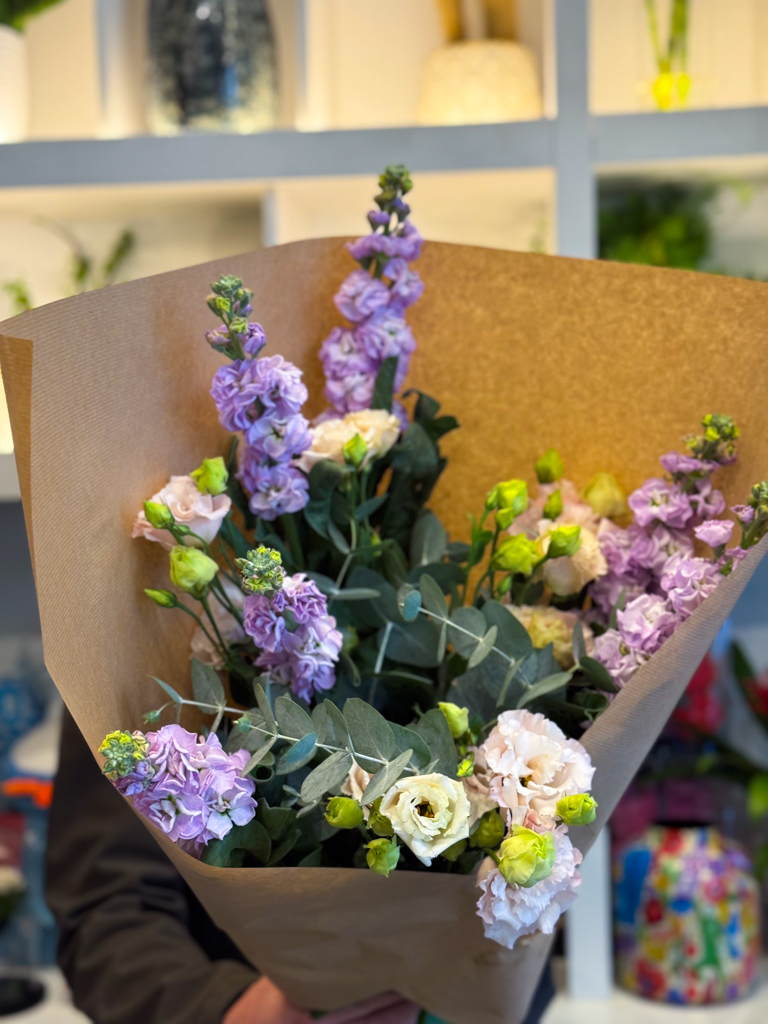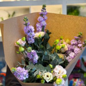 Η Αρωματική Ανθοδέσμη με Βιολέτες, Λυσίανθο & Ευκάλυπτο είναι μια ρομαντική σύνθεση σε ροζ–λιλά αποχρώσεις, που ξεχωρίζει για το φίνο άρωμά της και τη φυσική της κομψότητα. Οι βιολέτες χαρίζουν γλυκό άρωμα και πλούσιο όγκο, ο λυσίανθος προσθέτει απαλότητα και διάρκεια, ενώ ο ευκάλυπτος ολοκληρώνει με φρεσκάδα και διακριτική ισορροπία.Μια ανθοδέσμη ιδανική για ρομαντικά δώρα, ευχαριστίες ή στιγμές χαλάρωσης, που συνδυάζει αρμονικά το χρώμα, το άρωμα και τη φυσική φινέτσα της άνοιξης.