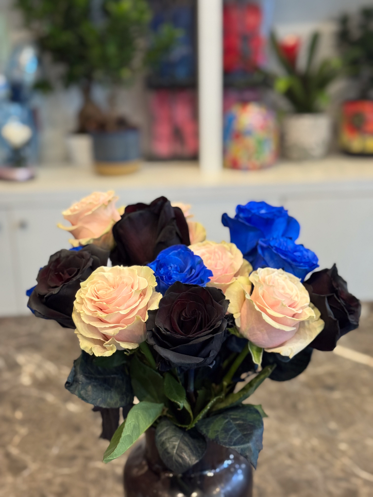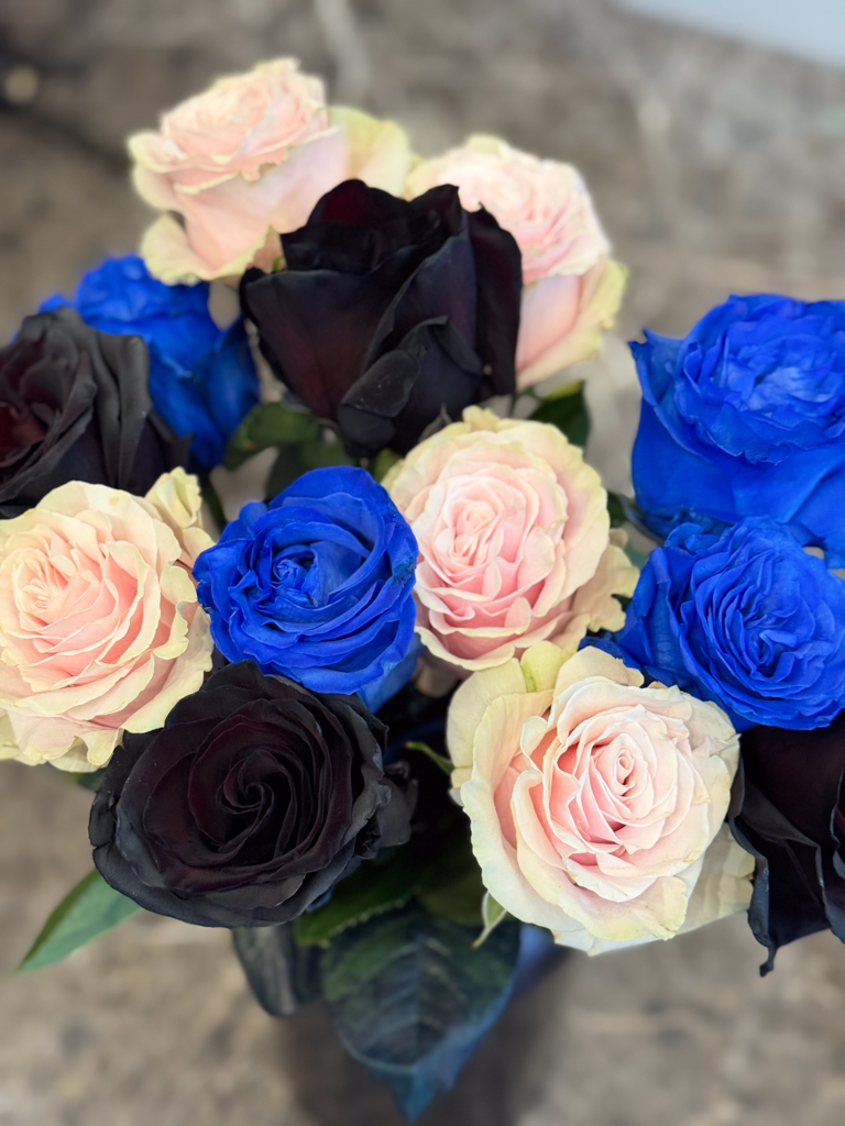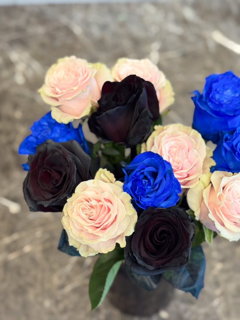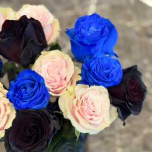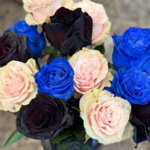 Οι αποχρώσεις των τριαντάφυλλων Κολομβίας δημιουργούν ένα φαντασμαγορικό φάσμα συναισθημάτων και αισθήσεων. Τα ροζ τριαντάφυλλα αποπνέουν τρυφερότητα και ρομαντισμό, τα κόκκινα εκφράζουν πάθος και αγάπη, ενώ τα μπλε φέρνουν μια αίσθηση μυστηρίου, σπανιότητας και βάθους. Τα μαύρα τριαντάφυλλα αποτελούν σύμβολο δύναμης, πρωτοτυπίας και έντονου χαρακτήρα, προσδίδοντας μια δραματική, καλλιτεχνική διάσταση στη σύνθεση. Ο συνδυασμός όλων αυτών των αποχρώσεων σε ένα mix δημιουργεί ένα μπουκέτο γεμάτο αντιθέσεις, αρμονία και ένταση — μια πραγματική γιορτή του χρώματος και της αίσθησης.