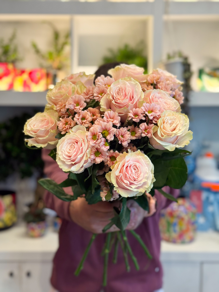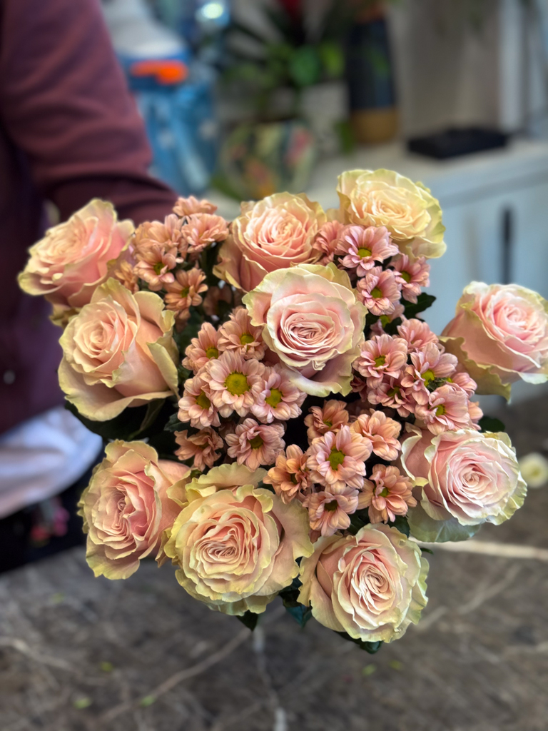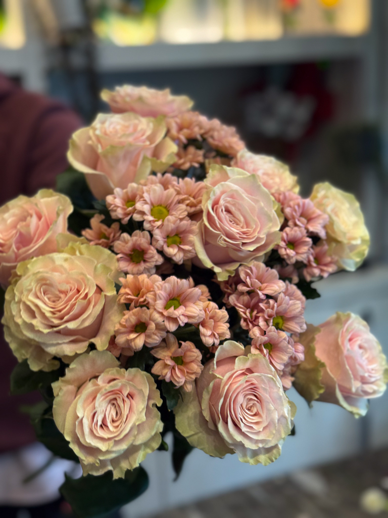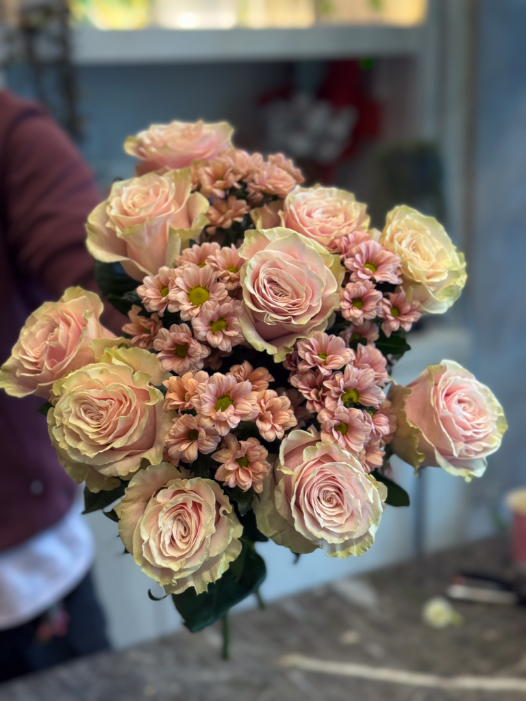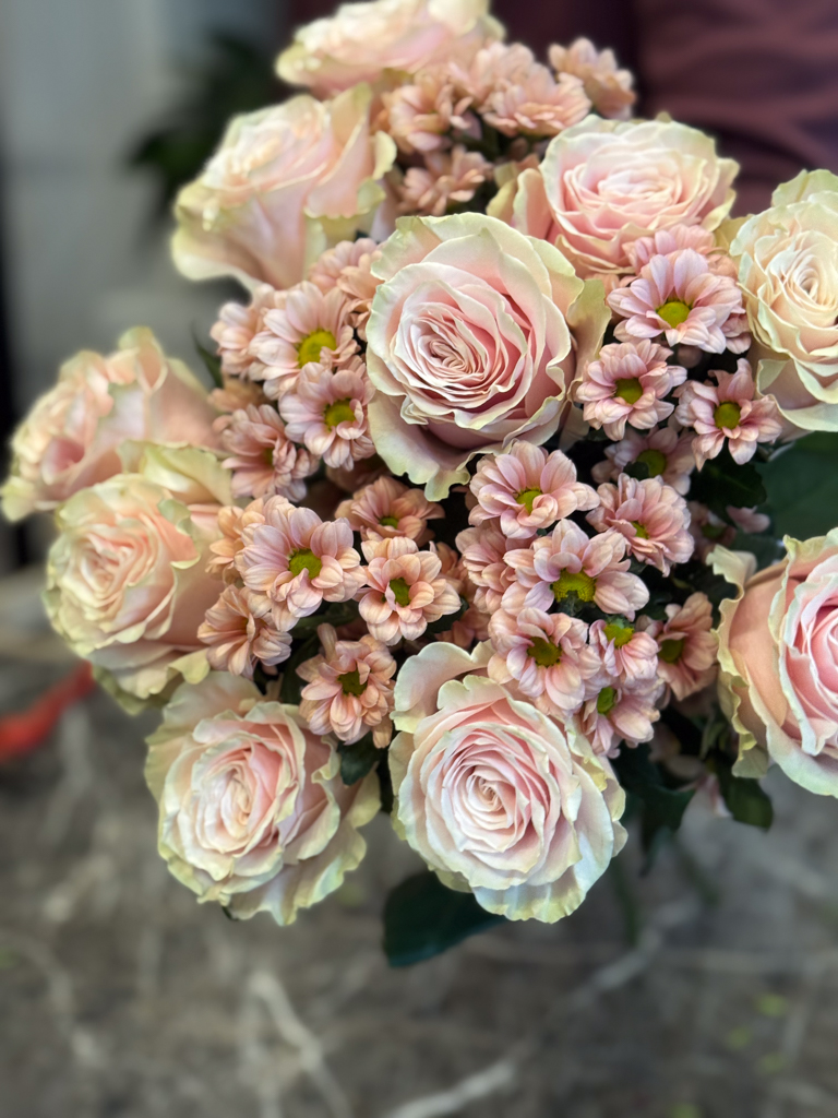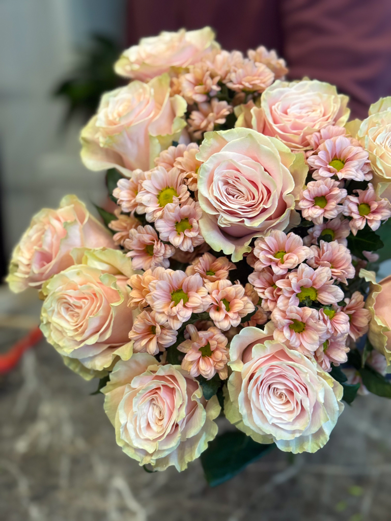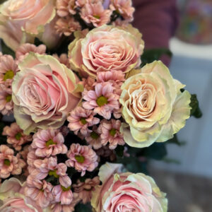 Στο επίκεντρο της σύνθεσης βρίσκονται τα τριαντάφυλλα Εκουαδόρ — ίσως τα πιο εκλεκτά τριαντάφυλλα στον κόσμο, γνωστά για τα μεγάλα τους άνθη, τα σταθερά τους στελέχη και τα πυκνά, μεταξένια πέταλα. Οι απαλές σομόν αποχρώσεις τους διαβαθμίζονται από ένα απαλό ροζ στο κέντρο μέχρι ένα ελαφρύ κρεμ στις άκρες, δημιουργώντας μια φυσική μετάβαση που αποπνέει τρυφερότητα και φως. Ανάμεσά τους, τα χρυσάνθεμα σαντίνι σε παστέλ ροζ τόνους προσθέτουν όγκο και αντίθεση, δίνοντας ρυθμό και κίνηση στην ανθοδέσμη. Τα μικρά, συμμετρικά τους άνθη λειτουργούν ως φυσικός σύνδεσμος ανάμεσα στα τριαντάφυλλα, προσδίδοντας ένα αίσθημα πληρότητας και αρμονίας. Ο συνδυασμός αυτών των δύο λουλουδιών ενώνει την πολυτέλεια με τη φρεσκάδα, δημιουργώντας μια σύνθεση που μοιάζει ταυτόχρονα εκλεπτυσμένη και ανεπιτήδευτη.