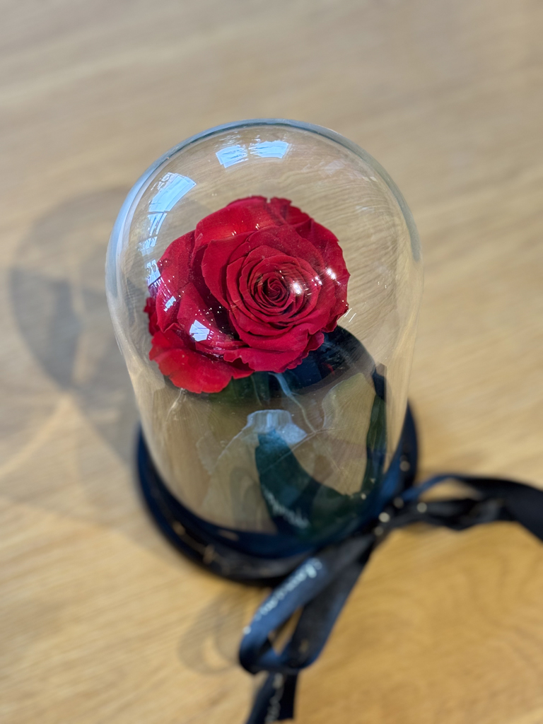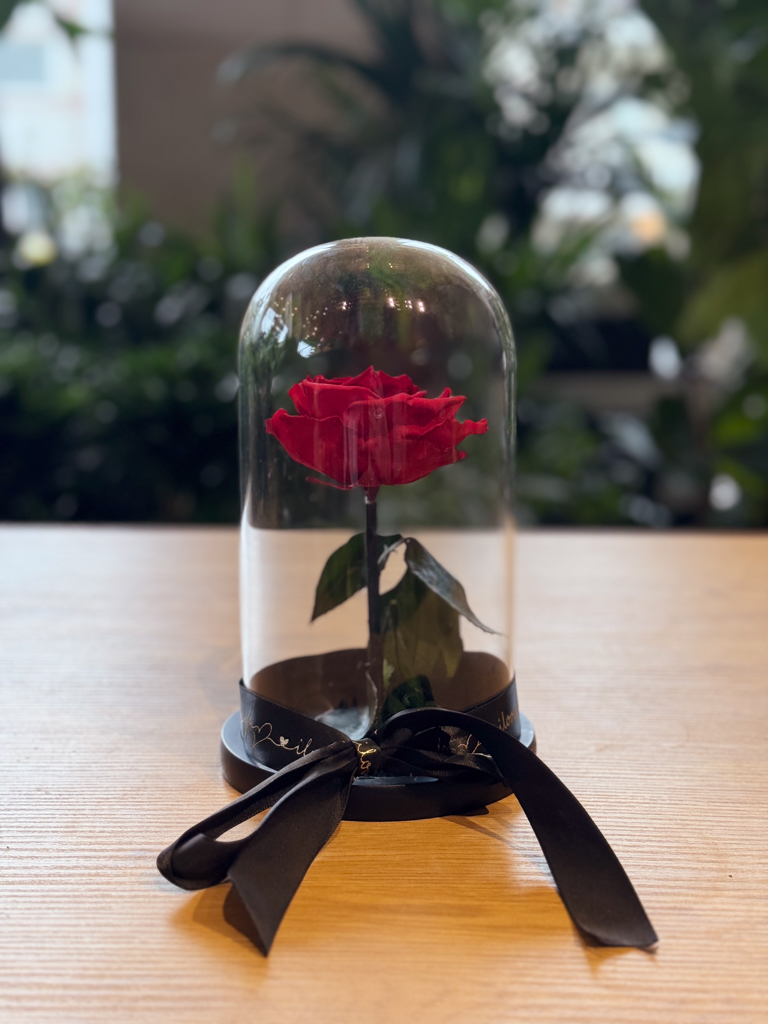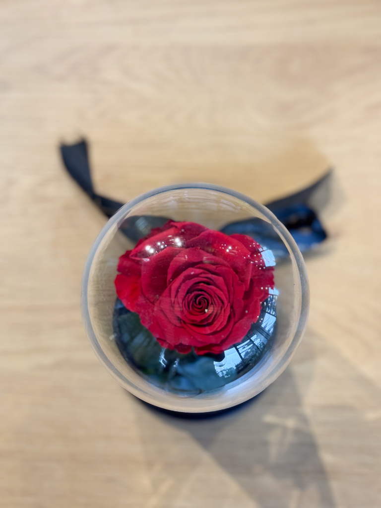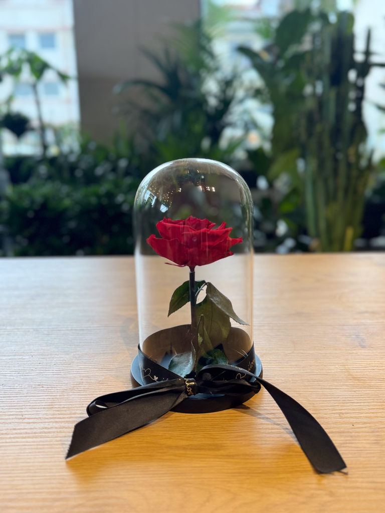 Ένα αληθινό τριαντάφυλλο, διατηρημένο με ειδική μη τοξική μέθοδο ώστε να παραμένει φρέσκο και λαμπερό για 3–5 χρόνια.