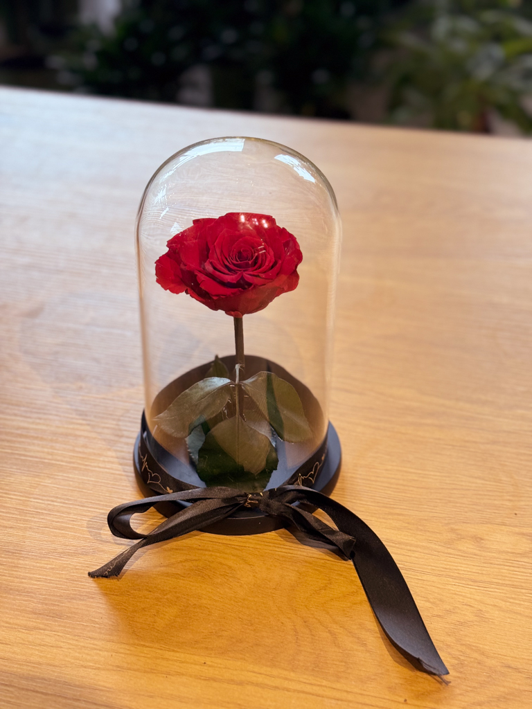 Παρουσιάζεται σε γυάλινο θόλο με ξύλινη βάση και κομψό κουτί δώρου, εμπνευσμένο από την ταινία “Η Πεντάμορφη και το Τέρας”.